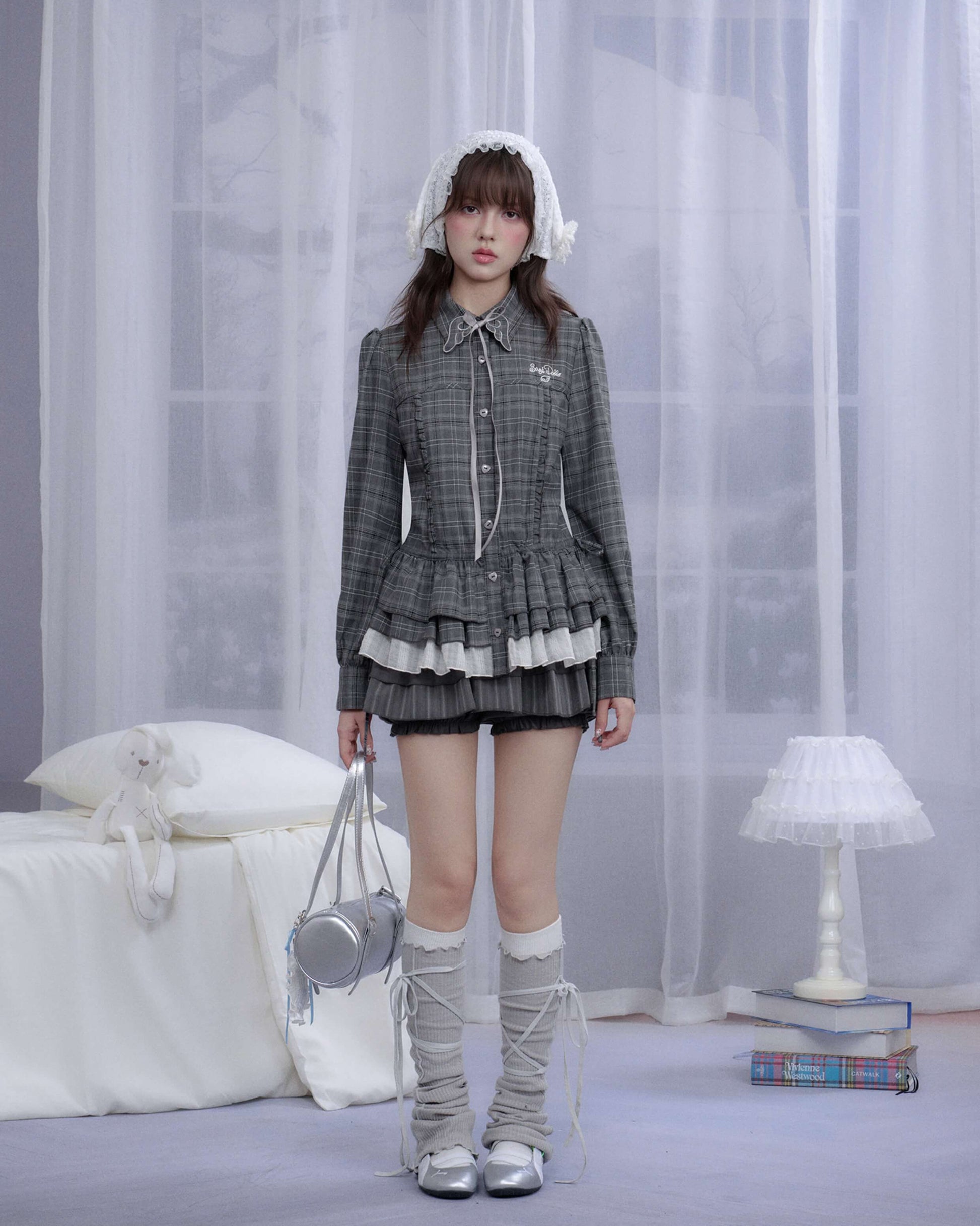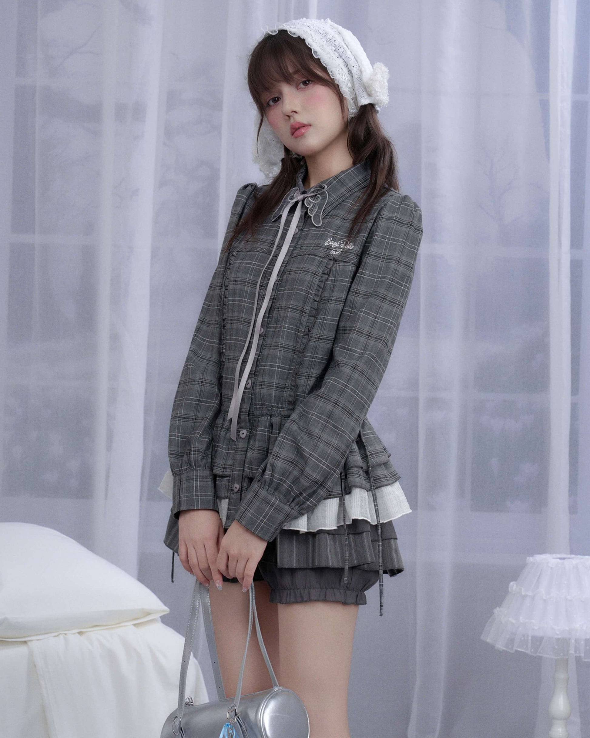 CHECK FRILL BUCKLE-NECK CORSET SHIRT